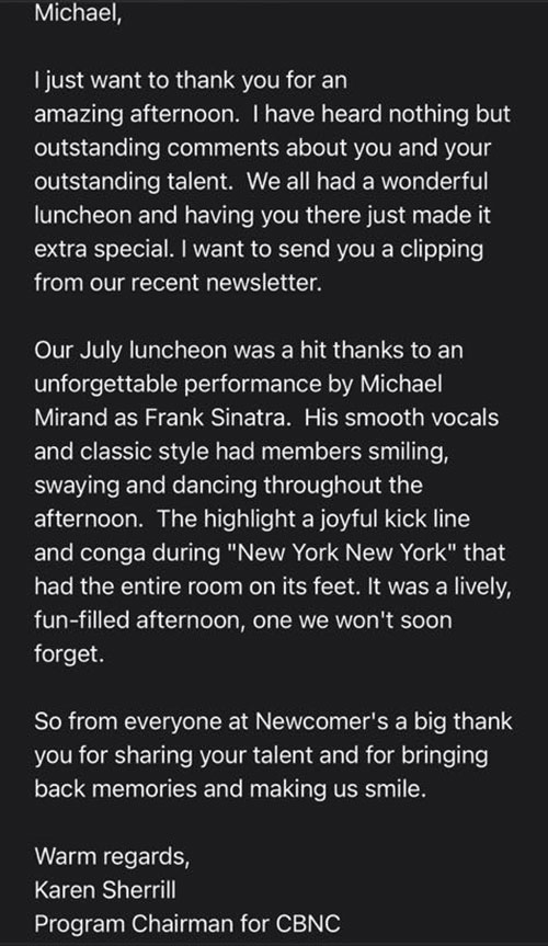 Michael-Thank you so much for such a wonderful evening. I am so thrilled to have finally heard you, as your reviews from the past were fantastic. You certainly  delivered.  We have your CD-s now and will be enjoying them too!  Thanks again for everything. I will save this poster as I am sure we are doing this again! I hope you feel the same.  Safe travel and we'll be in touch soon - Again, thank you.
